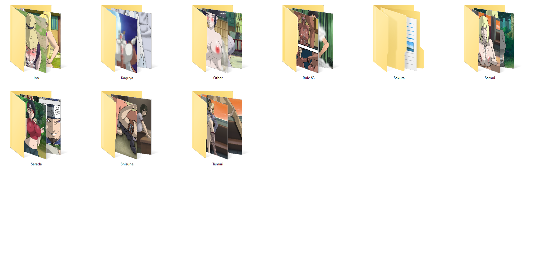 Naruto - Boruto (Ino -8 images; Kaguya - 5 images +1 gif; Other - 15 images; Rule 63 - 59 images +1gif; Sakura - 56 images +10 gif; Samui - 4 images; Sarada - 8 images +2 gif; Shizune - 2 images; Temari - 6 images)